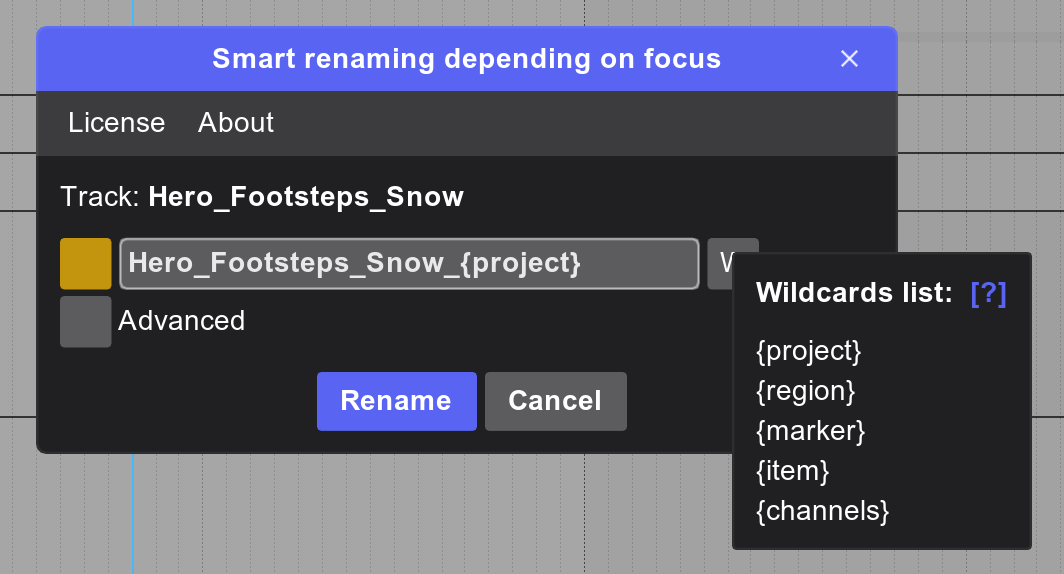 Sometimes you may need to take the name from another element—for example, using the item or track name for a region. To quickly rename a large number of elements, the script includes a wildcard system. It takes the current context into account, and by pressing the W button, you can choose any element to include in the name.