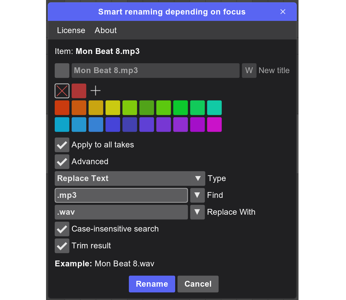 - Renaming of items, tracks, regions, and markers based on the selected context